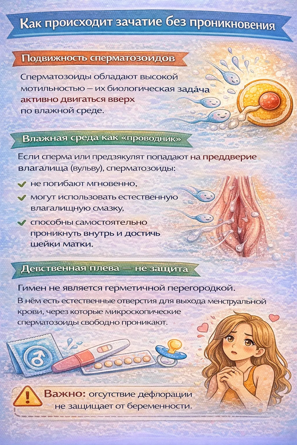 Распространённое заблуждение — что для беременности нужен полноценный вагинальный секс. С точки зрения физиологии это не так.