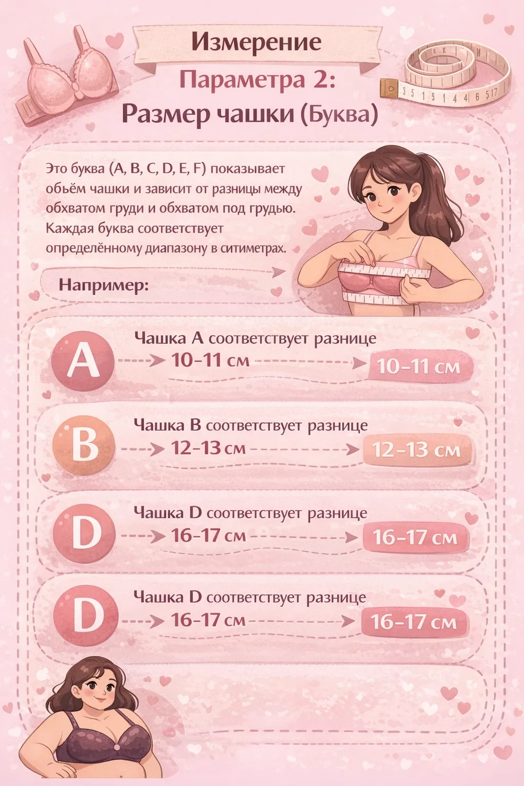 Это буква (A, B, C, D, E, F) показывает объём чашки и зависит от разницы между обхватом груди и обхватом под грудью. Каждая буква соответствует определённому диапазону в сантиметрах.