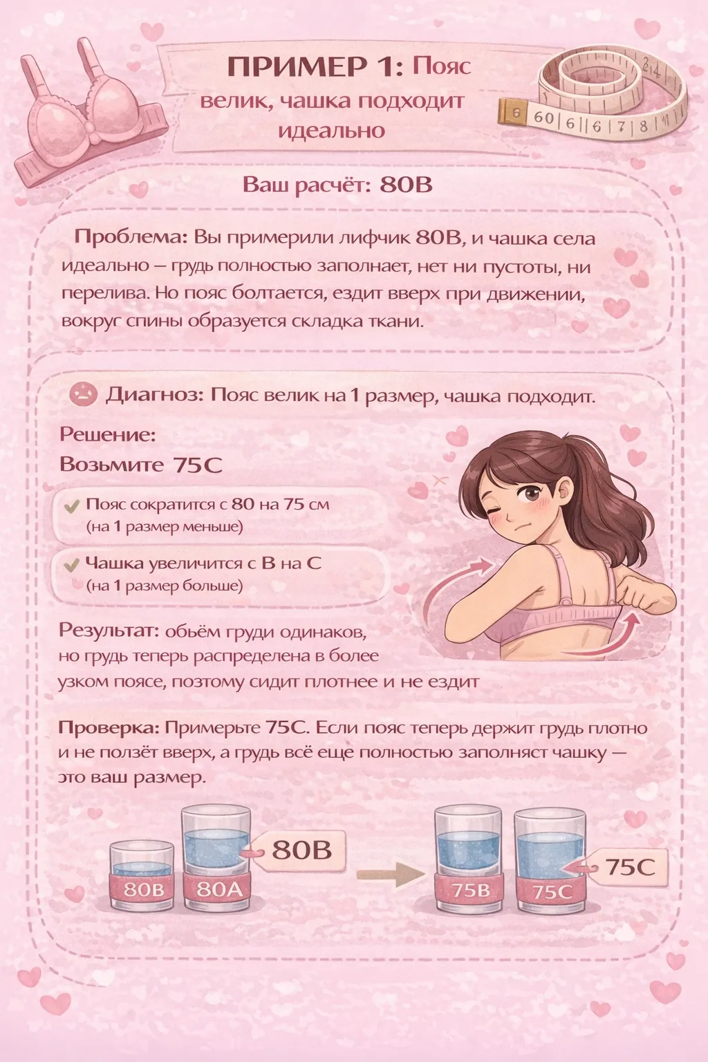 - Пояс велик — грудь падает вниз, косточка впивается в рёбра. Решение: возьмите пояс меньше на 1 размер, чашку больше на 1 размер (например, 80B → 75C).