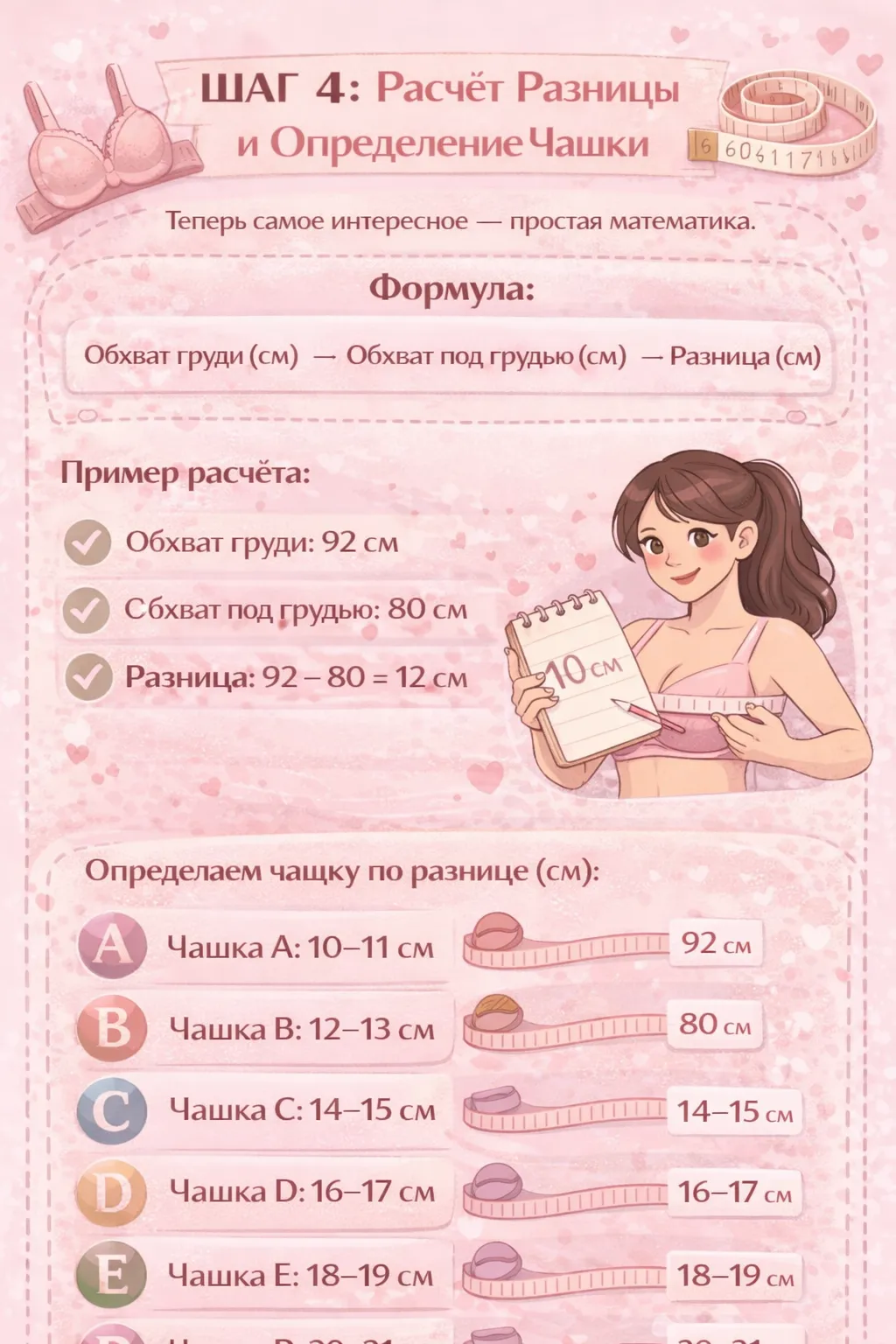 Шаг 3: Вычтите из обхвата груди обхват под грудью. Получилась разница.