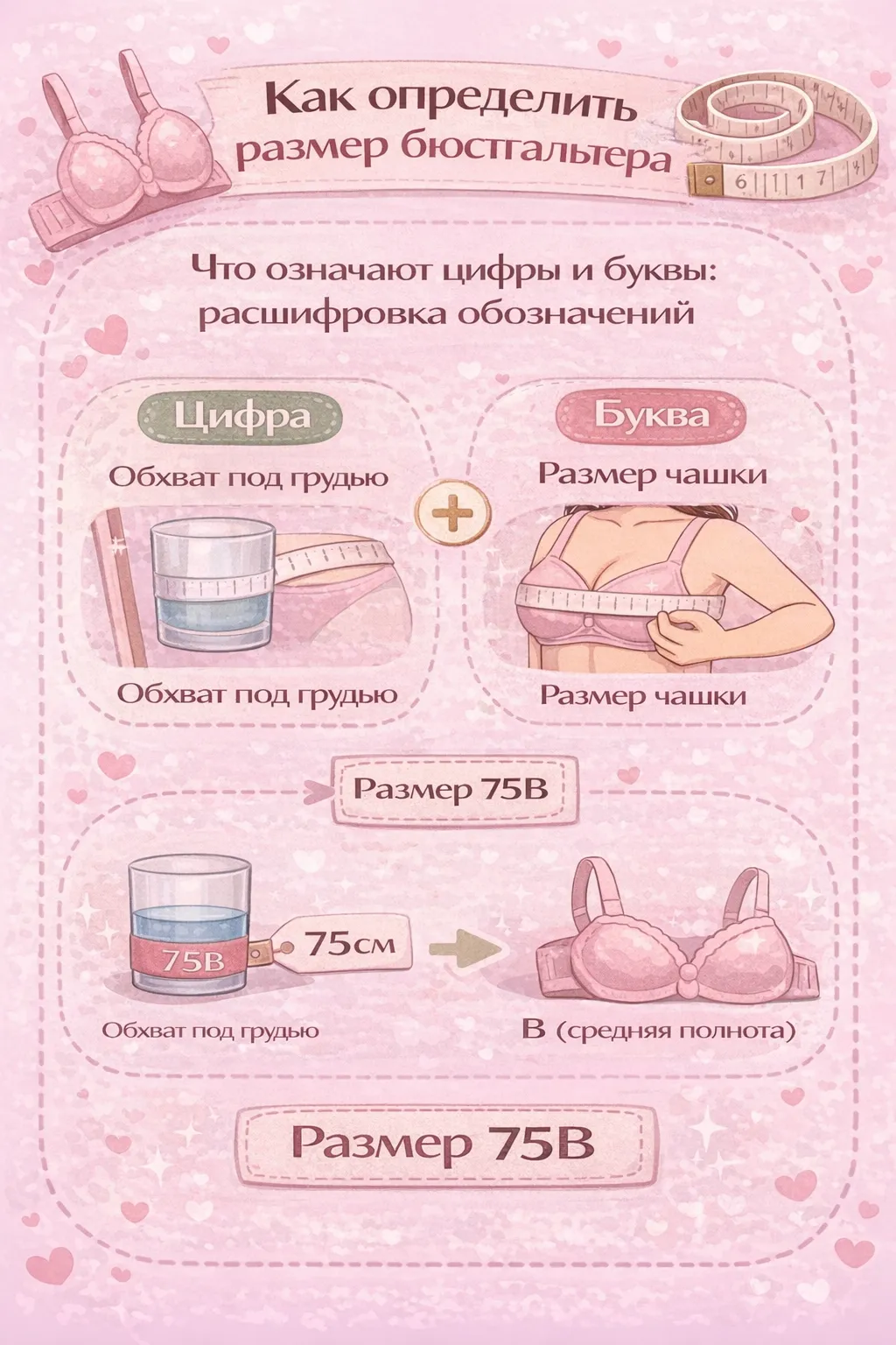 Размер бюстгальтера состоит из двух компонентов: цифры и буквы (иногда двух букв). Каждый имеет четкое значение: