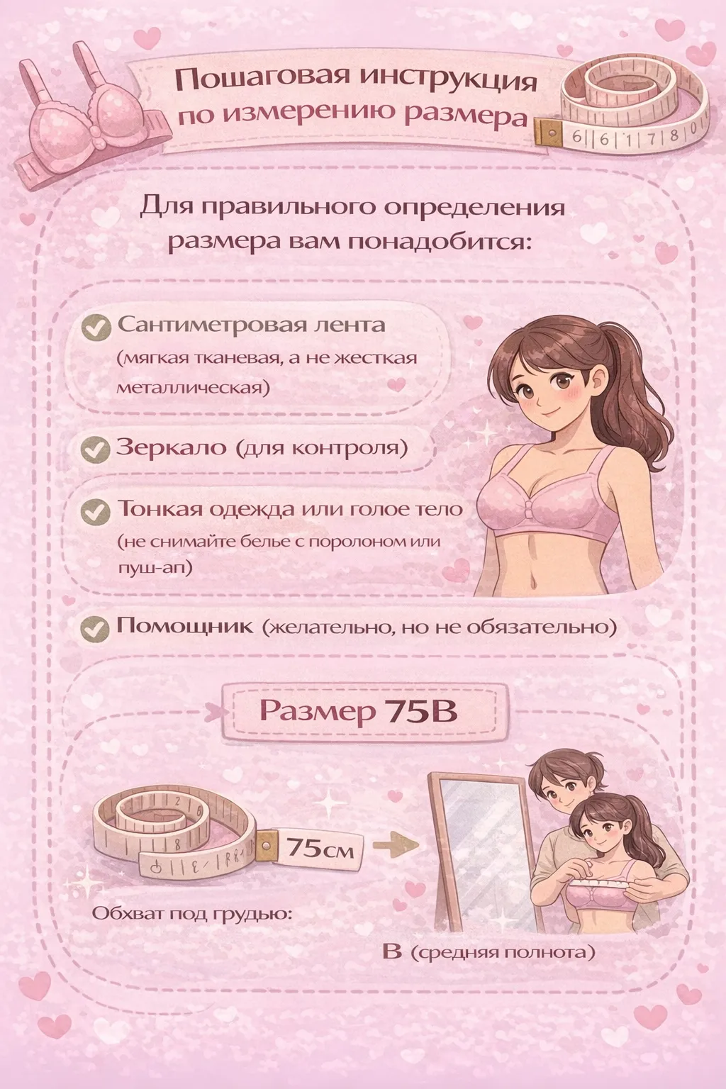 - Пошаговую инструкцию по измерению груди