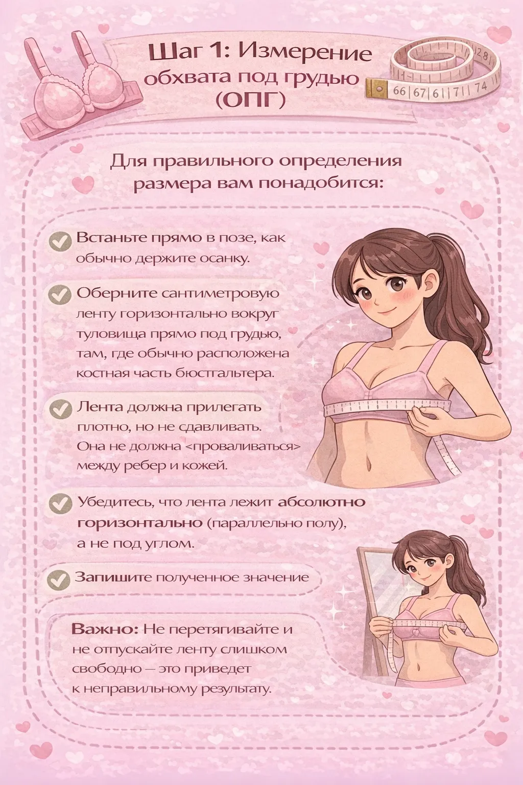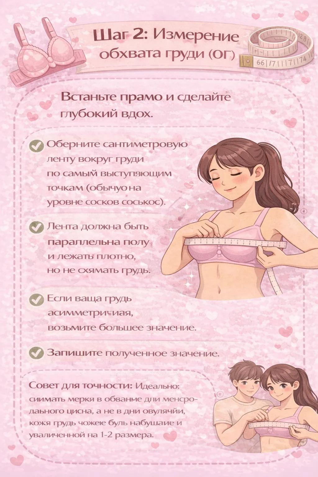 Совет для точности: Идеально снимать мерки в обычные дни менструального цикла, а не в дни овуляции, когда грудь может быть набухшей и увеличенной на 1-2 размера.